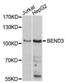 - Western blot analysis of extracts of various cell lines, using BEND3 antibody at 1:1000 dilution. The secondary antibody used was an HRP Goat Anti-Rabbit IgG (H+L) at 1:10000 dilution. Lysates were loaded 25ug per lane and 3% nonfat dry milk in TBST was used for blocking. An ECL Kit was used for detection and the exposure time was 90s.