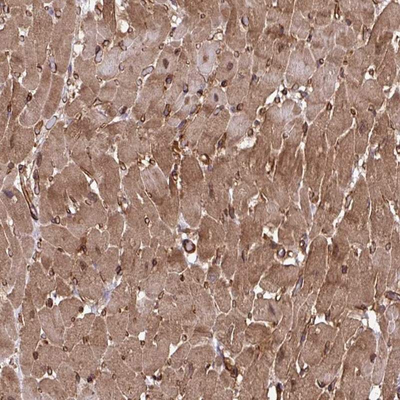 - Immunohistochemical analysis of TRIM52 in human heart muscle using TRIM52 Polyclonal Antibody (Product # PA5-63353) shows moderate cytoplasmic positivity in myocytes.