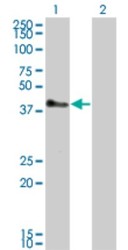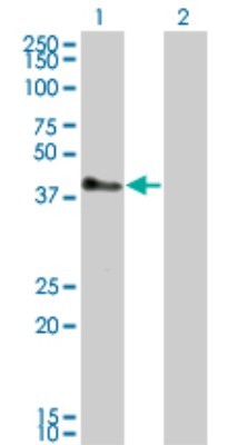 - Western Blot: TRIM52 Antibody (6D5) [H00084851-M01] - Analysis of TRIM52 expression in transfected 293T cell line by TRIM52 monoclonal antibody (M01), clone 6D5.Lane 1: TRIM52 transfected lysate(34.653 KDa).Lane 2: Non-transfected lysate.