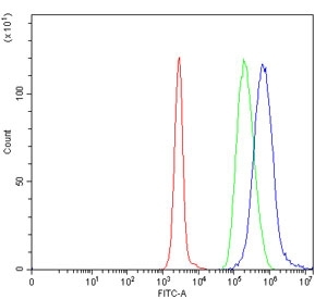 - Flow cytometry testing of human Daudi cells with TIGD3 antibody at 1ug/million cells (blocked with goat sera); Red=cells alone, Green=isotype control, Blue= TIGD3 antibody.