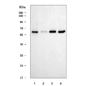 - Western blot testing of human 1) HepG2, 2) T-47D, 3) SH-SY5Y and 4) MCF7 cell lysate with TIGD3 antibody. Predicted molecular weight ~52 kDa.