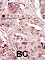 - Formalin-fixed and paraffin-embedded human cancer tissue reacted with SRMS polyclonal antibody (Cat # PAB3437) , which was peroxidase-conjugated to the secondary antibody, followed by AEC staining. This data demonstrates the use of this antibody for immunohistochemistry ; clinical relevance has not been evaluated. BC = breast carcinoma.