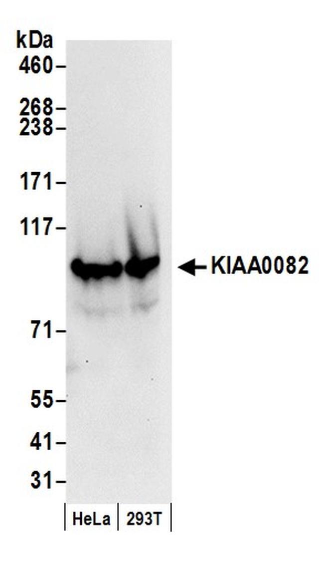- Detection of human KIAA0082 by western blot. Samples: Whole cell lysate (50 µg) from HeLa and 293T cells prepared using NETN lysis buffer. Antibody: Affinity purified rabbit anti-KIAA0082 antibody A300-304A-M (lot A300-304A-M-1) used at 1:1000. Detection: Chemiluminescence with an exposure time of 10 seconds.