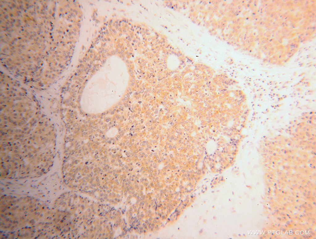 - Immunohistochemical of paraffin-embedded human liver cancer using 14990-1-AP(RPL39 antibody) at dilution of 1:100 (under 10x lens)