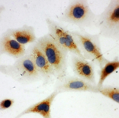- ICC analysis of NDUFA1 using anti-NDUFA1 antibody. NDUFA1 was detected in immunocytochemical section of A549 cell. Heat mediated antigen retrieval was performed in citrate buffer (pH6, epitope retrieval solution) for 20 mins. The tissue section was blocked with 10% goat serum. The tissue section was then incubated with 1µg/ml rabbit anti-NDUFA1 Antibody overnight at 4°C. Biotinylated goat anti-rabbit IgG was used as secondary antibody and incubated for 30 minutes at 37°C. The tissue section was developed using Strepavidin-Biotin-Complex (SABC) with DAB as the chromogen.