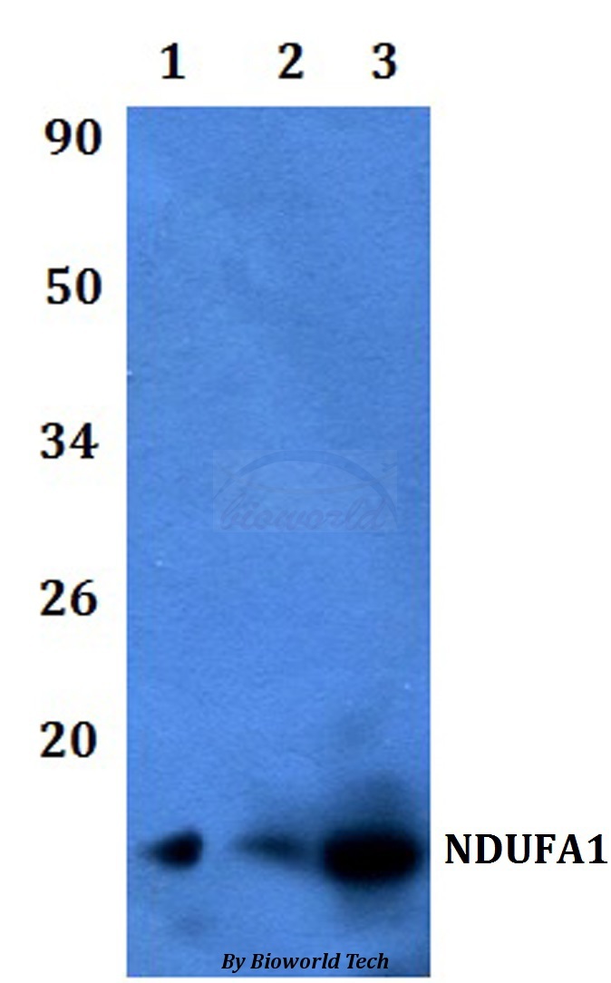 - Western blot (WB) analysis of NDUFA1 pAb at 1:500 dilution Lane1:HELA whole cell lysate Lane2:RAW264.7 whole cell lysate Lane3:SP20 whole cell lysate