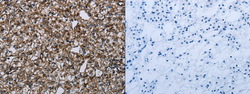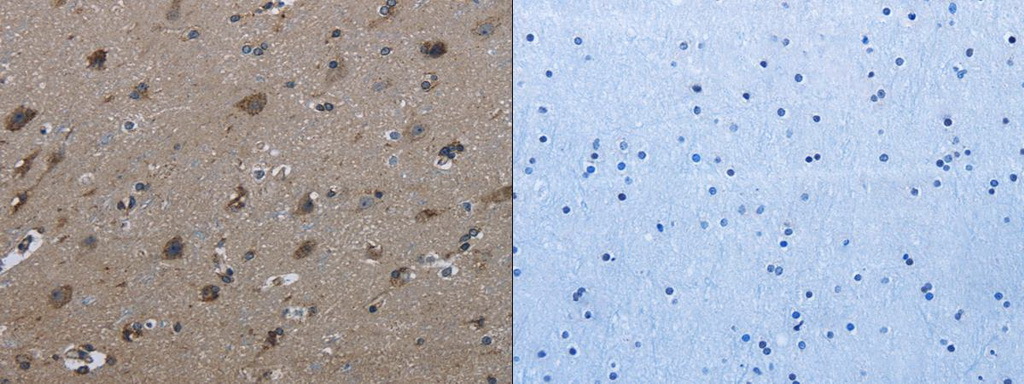 - The image on the left is immunohistochemistry of paraffin-embedded Human brain tissue using (FAM89B Antibody) at dilution 1/30, on the right is treated with fusion protein. (Original magnification: ?200)