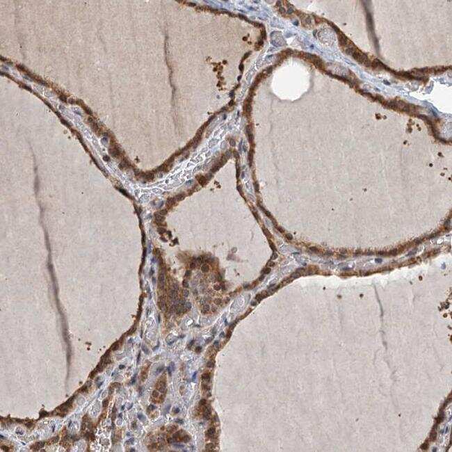 - Immunohistochemical analysis of ZNF527 in human thyroid gland using ZNF527 Polyclonal Antibody (Product # PA5-58084) shows moderate cytoplasmic positivity in glandular cells.