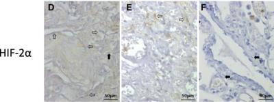 - Immunohistochemistry: HIF-2 alpha/EPAS1 Antibody [NB100-122] - Expression of hypoxia-inducible alpha subunits in normal and diseased lung tissue. HIF-2alpha expression are more evident in fibroblasts from idiopathic pulmonary fibrosis (d) than from lung tissue affected by other inflammatory conditions (i.e. chronic bronchitis, panel e) or normal lung tissue (f); as demonstrated by a higher proportion of positive fibroblasts (open arrows) than negative ones (solid black arrows). Image collected and cropped by CiteAb from the following publication (https://respiratory-research.biomedcentral.com/articles/10.1186/s12931-019-1100-4) licensed under a CC-BY licence.