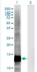 - Western Blot: CRIPT Antibody (4D7) [H00009419-M03-100ug] - Analysis of CRIPT expression in transfected 293T cell line by CRIPT monoclonal antibody (M03), clone 4D7. Lane 1: CRIPT transfected lysate (Predicted MW: 11.2 KDa). Lane 2: Non-transfected lysate.