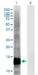 - Western Blot analysis of CRIPT expression in transfected 293T cell line by CRIPT monoclonal antibody (M03), clone 4D7.Lane 1: CRIPT transfected lysate (Predicted MW: 11.2 KDa).Lane 2: Non-transfected lysate.