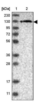 - Western Blot: USP48 Antibody [NBP1-83751] - Lane 1: Marker [kDa] 230, 130, 95, 72, 56, 36, 28, 17, 11. Lane 2: Human cell line RT-623