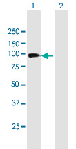 - Western Blot analysis of PCDH21 expression in transfected 293T cell line (H00092211-T01) by PCDH21 MaxPab polyclonal antibody.Lane 1: PCDH21 transfected lysate(81.95 KDa).Lane 2: Non-transfected lysate.