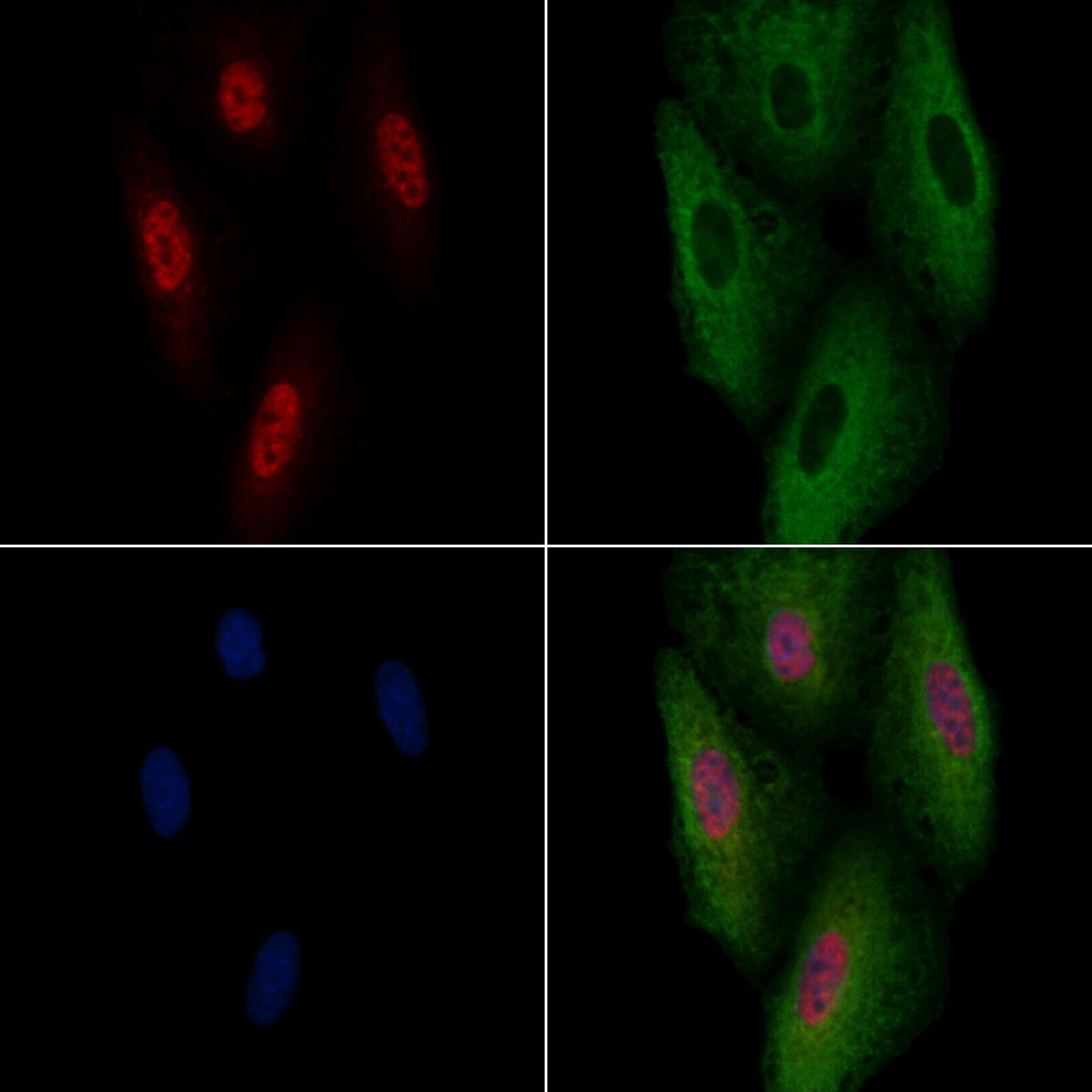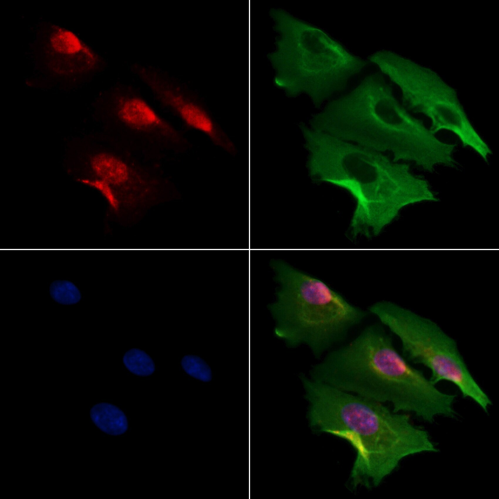 - Immunofluorescent analysis of MDFI in HepG2. Samples were fixed with paraformaldehyde, permeabilized with 0.1% Triton X-100, blocked with 10% serum (45 min at 25°C) incubated with MDFI polyclonal antibody (Product # PA5-101683) using a dilution of 1:200 (1 hr, 37°C), and followed by goat anti-rabbit IgG Alexa Fluor 594 at a dilution of 1:600.