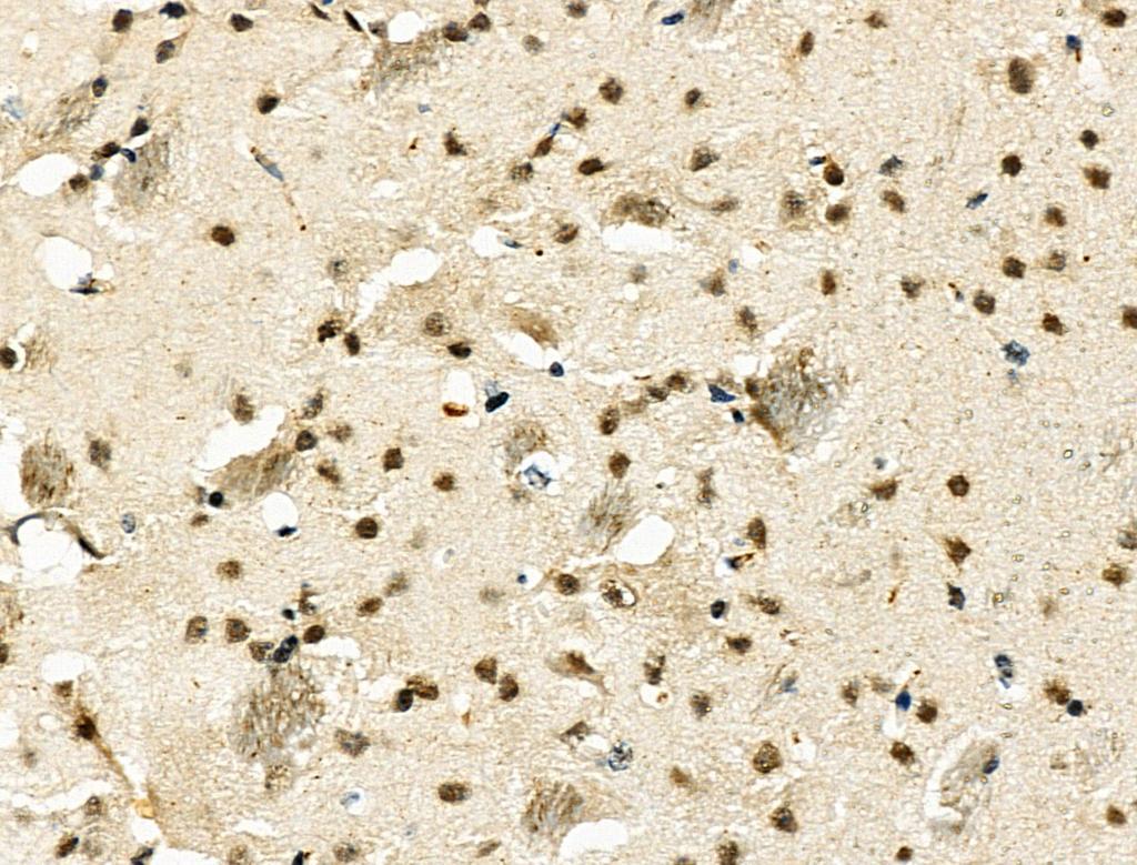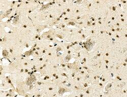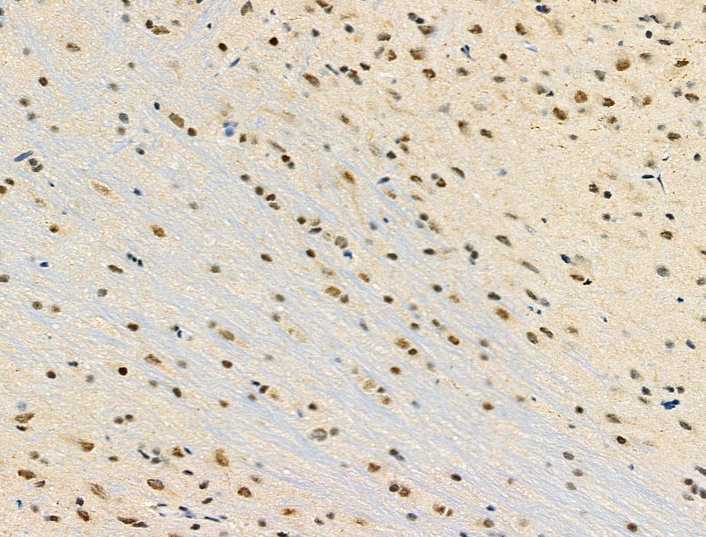 - Immunohistochemistry analysis of MDFI in rat brain tissue. The sample was formaldehyde fixed and a heat mediated antigen retrieval step in citrate buffer was performed. Samples were incubated with MDFI polyclonal antibody (Product # PA5-101683) using a dilution of 1:100 (4°C overnight) followed by HRP conjugated anti-Rabbit secondary antibody.