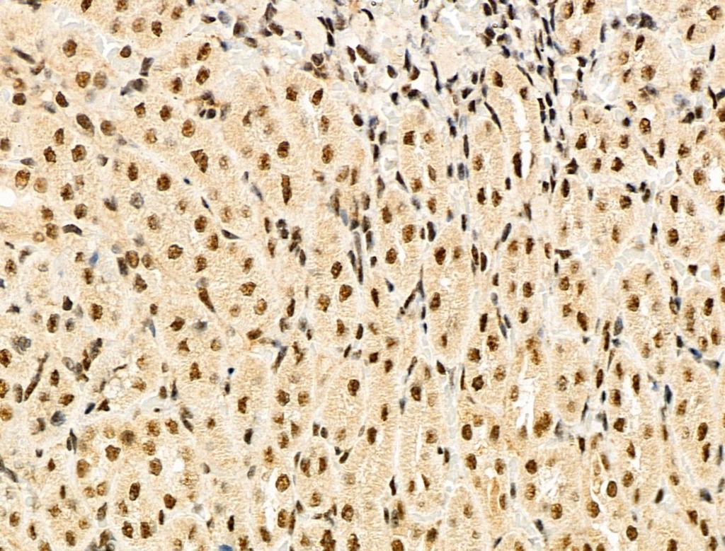 - Immunohistochemistry analysis of MDFI in rat kidney tissue. The sample was formaldehyde fixed and a heat mediated antigen retrieval step in citrate buffer was performed. Samples were incubated with MDFI polyclonal antibody (Product # PA5-101683) using a dilution of 1:100 (4°C overnight) followed by HRP conjugated anti-Rabbit secondary antibody.