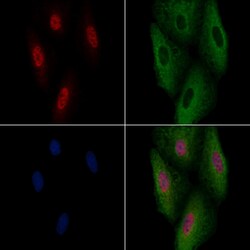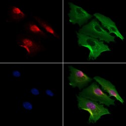- Immunocytochemistry analysis of MDFI in A549 cells. The samples were fixed with PFA and permeabilized in 0.1% Triton X-100, then blocked in 10% serum for 45 minutes at 25°C. Samples were incubated with MDFI polyclonal antibody (Product # PA5-101683) and mouse anti-beta tubulin antibody for 1 hour at 37°C. An AlexaFluor594 conjugated goat anti-rabbit IgG(H+L) (Red) and an AlexaFluor488 conjugated goat anti-mouse IgG(H+L) (Green) were used as the secondary antibodies. The nuclear counter stain is DAPI (blue).