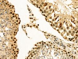 - Immunohistochemistry analysis of MDFI in rat testis tissue. The sample was formaldehyde fixed and a heat mediated antigen retrieval step in citrate buffer was performed. Samples were incubated with MDFI polyclonal antibody (Product # PA5-101683) using a dilution of 1:100 (4°C overnight) followed by HRP conjugated anti-Rabbit secondary antibody.