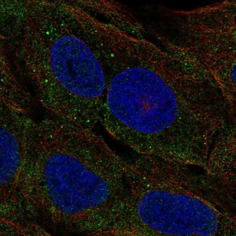 - Immunofluorescent staining of human cell line U-2 OS shows localization to cytosol.