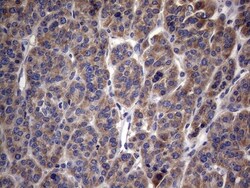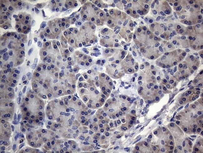 - Immunohistochemical staining of paraffin-embedded human pancreas tissue within the normal limits using anti-MRPL42 mouse monoclonal antibody. (Heat-induced epitope retrieval by 1mM EDTA in 10mM Tris buffer (pH8.5) at 120°C for 3 min, TA809379)(1:150).