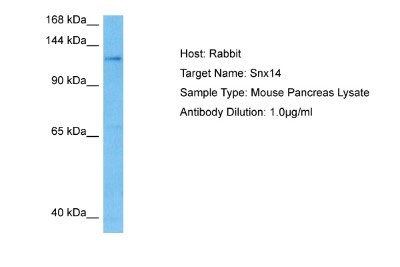 - Western Blot: SNX14 Antibody [NBP2-83570] - Host: Rabbit. Target Name: SNX14. Sample Tissue: Mouse Pancreas lysates. Antibody Dilution: 1ug/ml