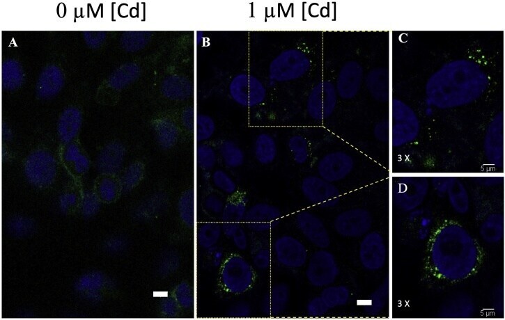 - Fig. 3 Immunofluorescence determination of hCTR1 subcellular localization in HepG2 cells in the presence or absence of Cd 2+ . Nuclei were stained with DAPI (S36973; Invitrogen), and CTR1 were probed with Alexa-488 anti-rabbit antibody. (A) Control, in the absence of Cd 2+ exposure. Scale bar, 10 mum. (B) Following exposure to 1 muM Cd 2+ for 24 h. Scale bar, 10 mum. (C) Zoom of HepG2 cells following Cd 2+ exposure. 3 x zoom; scale bar, 5 mum. (D) Zoom of another image frame following Cd 2+ exposure. 3 x zoom; scale bar, 5 mum. Fig. 3
