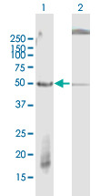 - Western Blot analysis of FBXW2 expression in transfected 293T cell line (H00026190-T01) by FBXW2 MaxPab polyclonal antibody.Lane 1: FBXW2 transfected lysate(49.94 KDa).Lane 2: Non-transfected lysate.
