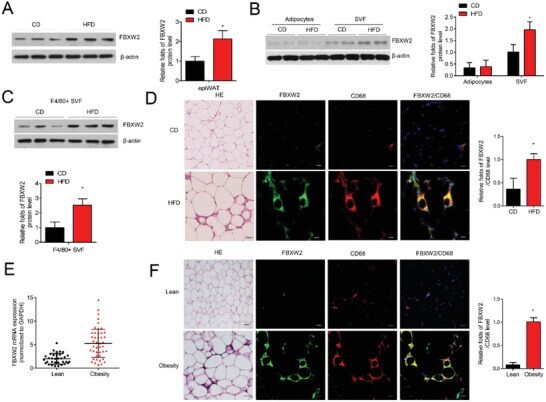 - Figure 1 FBXW2 expression in macrophages is upregulated from obese mice and humans. Eight-week-old C57BL/6J mice were fed either chow diet (CD) or high fat diet (HFD) for 12 weeks. A) FBXW2 expression in epiWAT was determined by western blot assay ( n = 8). B) Cell extracts from isolated adipocytes and SVFs in epiWAT were subject to western blot for the expression of FBXW2 ( n = 5). C) The protein level of FBXW2 in F4/80 + macrophages sorted from SVFs by western blot ( n = 5). D) Representative H&E staining of epiWAT, and the immunofluorescence images for CD68 (red) and FBXW2 (green) expression in epiWAT. Nuclei staining by DAPI (blue). Scale bars, 20 um. E) CD14 + macrophages were isolated from visceral adipose tissue of lean ( n = 33) and obese ( n = 42) subjects. The mRNA level of FBXW2 was tested by real-time qPCR assay. F) Representative H&E staining of visceral adipose tissues from lean and obese individuals, and the expressions of CD68 (red) and FBXW2 (green) were detected by immunofluorescence staining. Nuclei staining by DAPI (blue). Scale bars, 20 um. The data are shown as the mean +- SEM. * p < 0.05 by Student's t test or ANOVA with the post-hoc test.