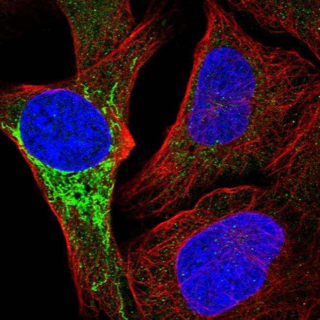 - Immunofluorescent staining of HAL in human cell line U-2 OS shows positivity in mitochondria. Samples were probed using a HAL Polyclonal Antibody (Product # PA5-58435).