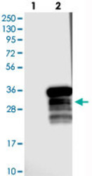 - Western blot analysis of Lane 1: Negative control (vector only transfected HEK293T lysate), Lane 2: Over-expression Lysate (Co-expressed with a C-terminal myc-DDK tag (~3.1 kDa) in mammalian HEK293T cells) with C6orf153 polyclonal antibody (Cat # PAB22368).