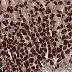 - Immunohistochemical staining of human stomach with C6orf153 polyclonal antibody (Cat # PAB22368) shows strong cytoplasmic positivity in Parietal cells at 1:50-1:200 dilution.