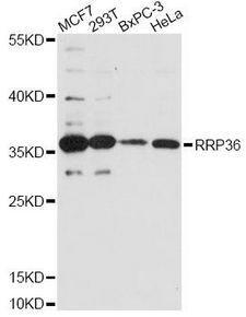 - Western blot analysis of extracts of various cell lines, using RRP36 antibody at 1:3000 dilution. The secondary antibody used was an HRP Goat Anti-Rabbit IgG (H+L) at 1:10000 dilution. Lysates were loaded 25ug per lane and 3% nonfat dry milk in TBST was used for blocking. An ECL Kit was used for detection and the exposure time was 90s.