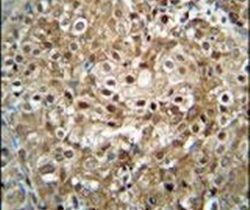 - Immunohistochemistry analysis in formalin-fixed, paraffin-embedded human cervix carcinoma using a CF153 polyclonal antibody (Product # PA5-24273), followed by HRP-conjugated secondary antibody and DAB staining.