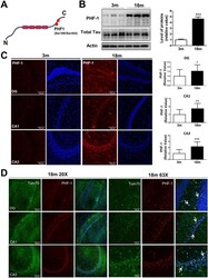 - Figure 3 Phosphorylated tau at Ser396/404 (PHF-1) epitopes increased during aging in the hippocampus. ( a ) Schematic representation of tau protein and the phosphorylation at Ser404/396 residues, epitope known as PHF-1. Created with BioRender.com, ( b ) Western blot of tau PHF-1 in hippocampal tissue of 3 and 18-month-old (mo) mice. Densitometric analysis is shown as relative values to the control. ( c ) Representative immunofluorescence images for PHF-1 tau DG, CA1, and CA3 hippocampal regions, with its quantitative fluorescence analysis. ( d ). Double staining for Tom70 (mitochondrial marker; green) and PHF-1 (Red) to analyze the colocalization of phosphorylated tau with mitochondria, in DG, CA1 and CA3 hippocampal regions. White arrows show co-localization between PHF-1 tau and mitochondria.The images were taken using a ( c ) 20 x objective and ( d ) 63 x objective. n = 3 different animals of each age. Graph bars represent means +- SEM. * p < 0.05. ** p < 0.01; *** p < 0.001. DG Dentate Gyrus, CA1 Cornu ammonis 1 and CA3 Cornu Ammonis 3.
