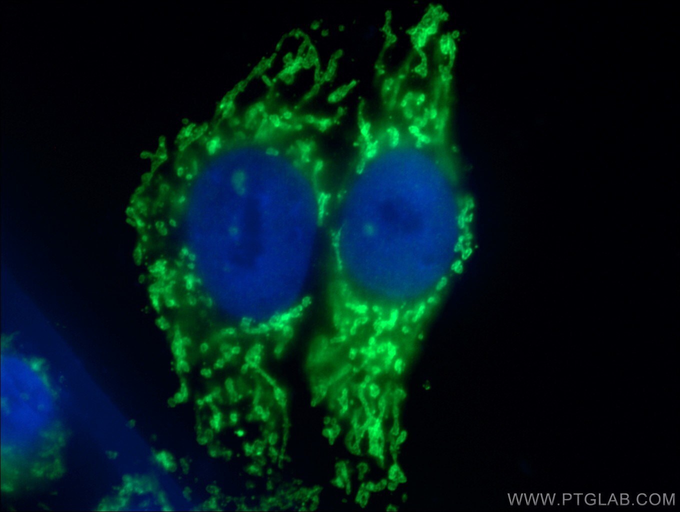 - Immunofluorescent analysis of Hela cells, using TOMM70A antibody 14528-1-AP at 1:25 dilution and Rhodamine-labeled goat anti-rabbit IgG (red).