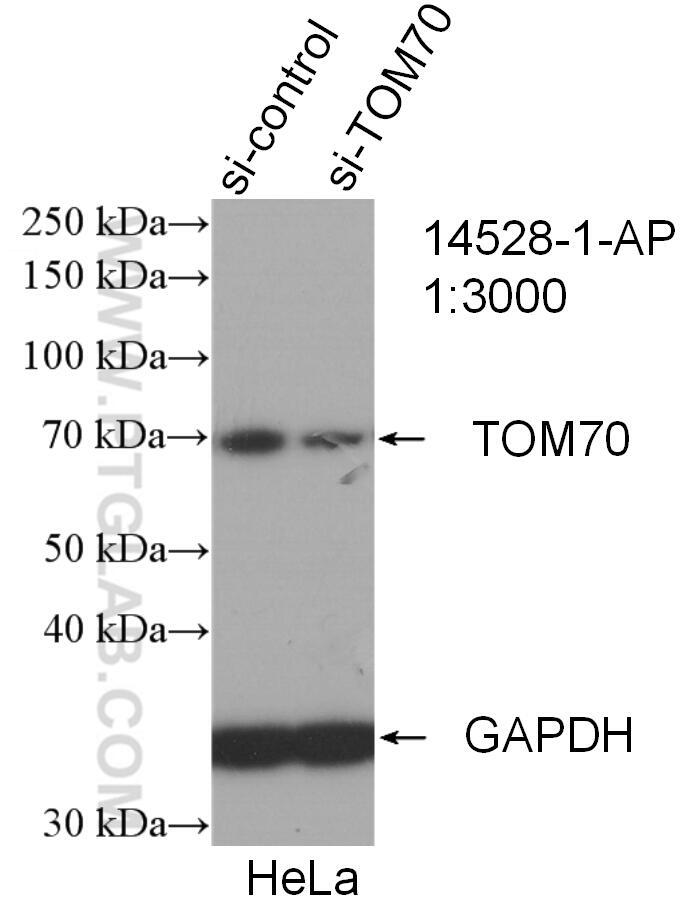 - WB result of TOM70 antibody (14528-1-AP; 1:3000; incubated at room temperature for 1.5 hours) with sh-Control and sh-TOM70 transfected HeLa cells.