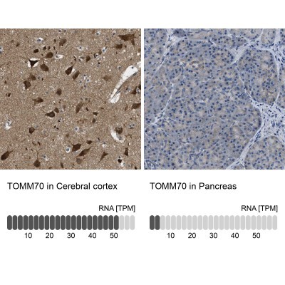 - Immunohistochemistry-Paraffin: TOM70 Antibody [NBP1-87863] - Staining in human cerebral cortex and pancreas tissues using anti-TOMM70 antibody. Corresponding TOMM70 RNA-seq data are presented for the same tissues.
