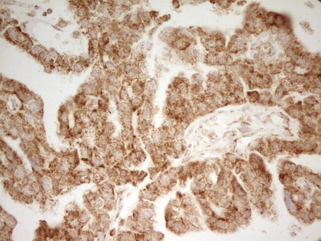 - Immunohistochemical staining of paraffin-embedded Carcinoma of Human thyroid tissue using anti-MRRF mouse monoclonal antibody. (Heat-induced epitope retrieval by 1 mM EDTA in 10mM Tris, pH8.5, 120°C for 3min, TA806103)