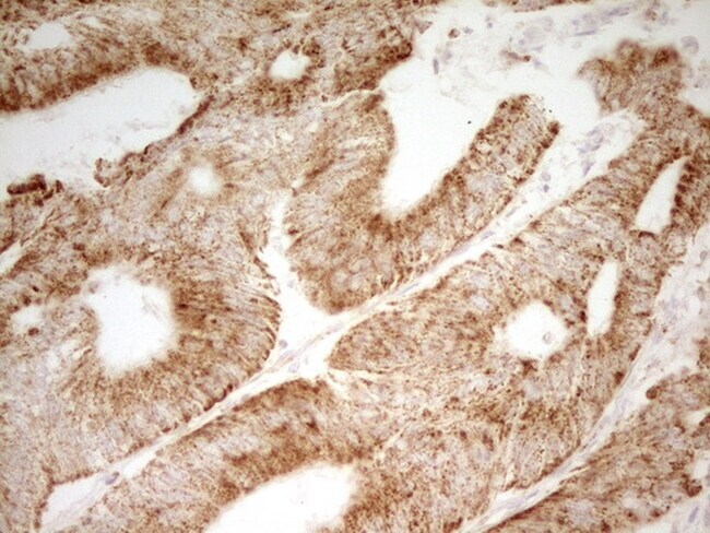 - Immunohistochemical staining of paraffin-embedded Adenocarcinoma of Human colon tissue using anti-MRRF mouse monoclonal antibody. (Heat-induced epitope retrieval by 1 mM EDTA in 10mM Tris, pH8.5, 120°C for 3min, TA806103)