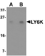 - Western blot analysis of LY6K in HeLa cell lysate with LY6K antibody Cat.-No AP55585PU-N at (A) 1 and (B) 2 ?g/ml.