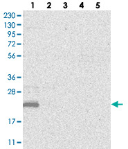 - Western blot analysis of Lane 1: RT-4, Lane 2: U-251 MG, Lane 3: Human Plasma, Lane 4: Liver, Lane 5: Tonsil with MOSPD1 polyclonal antibody (Cat # PAB22522).