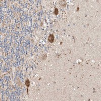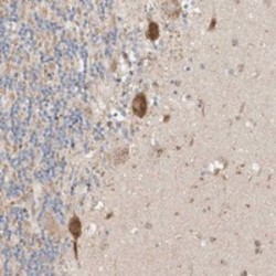 - Immunohistochemical staining of human cerebellum with MOSPD1 polyclonal antibody (Cat # PAB22522) shows strong cytoplasmic positivity in Purkinje cells at 1:200-1:500 dilution.