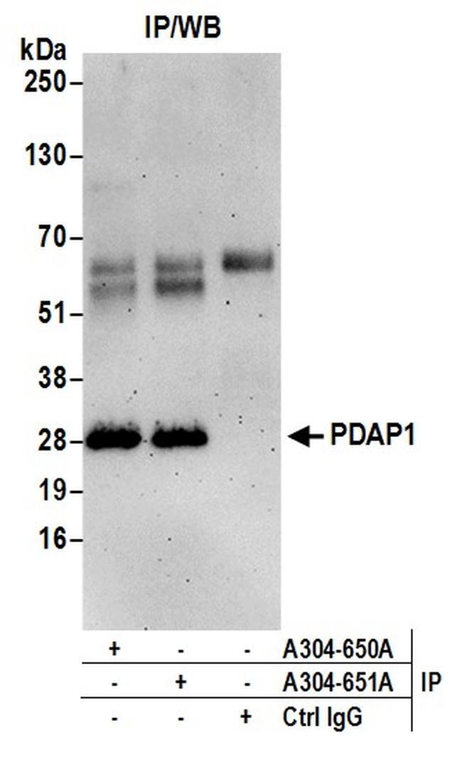 - Detection of human PDAP1 by western blot of immunoprecipitates. Samples: Whole cell lysate (0.5 or 1.0 mg per IP reaction; 20% of IP loaded) from 293T cells prepared using NETN lysis buffer. Antibodies: Affinity purified rabbit anti-PDAP1 antibody A304-650A (lot A304-650A-1) used for IP at 6 µg per reaction. PDAP1 was also immunoprecipitated by rabbit anti-PDAP1 antibody A304-651A. For blotting immunoprecipitated PDAP1, A304-650A was used at 1 µg/ml. Detection: Chemiluminescence with an exposure time of 3 minutes.