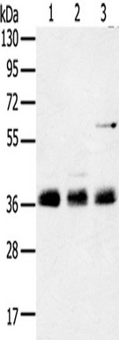 - Gel: 8%SDS-PAGE, Lysate: 60 ug, Lane 1-3: Mouse lung tissue, NIH/3T3 cells, hepg2 cells, Primary antibody: (ANKRD1 Antibody) at dilution 1/400, Secondary antibody: Goat anti rabbit IgG at 1/8000 dilution, Exposure time: 3 seconds