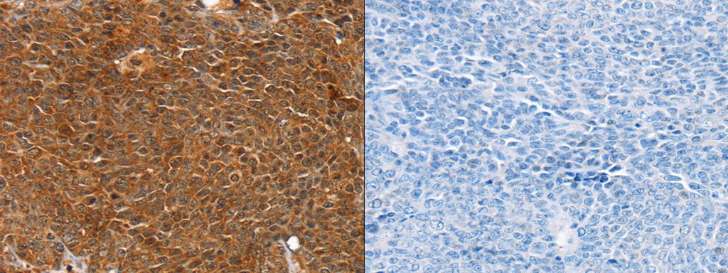 - The image on the left is immunohistochemistry of paraffin-embedded Human ovarian cancer tissue using (ANKRD1 Antibody) at dilution 1/20, on the right is treated with fusion protein. (Original magnification: ?200)
