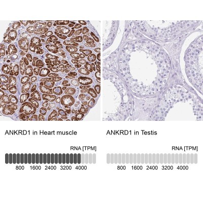 - Immunohistochemistry-Paraffin: ANKRD1 Antibody [NBP2-14292] - Staining in human heart muscle and testis tissues . Corresponding ANKRD1 RNA-seq data are presented for the same tissues.
