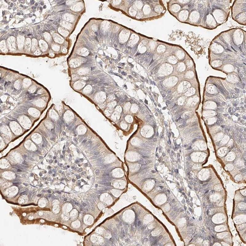 - Immunohistochemical analysis of ZNF789 in human small intestine using ZNF789 Polyclonal Antibody (Product # PA5-56172) shows strong luminal membranous positivity in glandular cells.