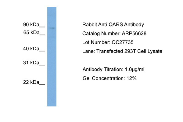 - Western blot analysis using Anti-QARS antibody detects protein at predicted molecular weight using transfected 293T cells as a positive control. Tissue/Lysate Concentration: 1ug/ml Antibody Concentration: 1.0ug/ml