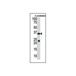 - Western blot analysis of anti-SULT4A1a/b Pab (Cat. # OAAB15967) in mouse cerebellum cell line lysate (35µg/lane). SULT4A1a/b(arrow) was detected using the purified Pab.