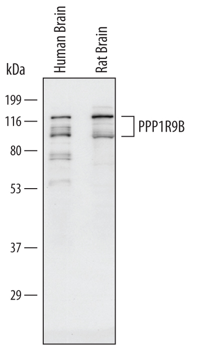 - Detection of Human and Rat PPP1R9B by Western Blot. Western blot shows lysates of human brain tissue and rat brain tissue. PVDF Membrane was probed with 1 µg/mL of Human/Rat PPP1R9B Antigen Affinity-purified Polyclonal Antibody (Catalog # AF6465) followed by HRP-conjugated Anti-Sheep IgG Secondary Antibody (Catalog # HAF016). Specific bands were detected for PPP1R9B at approximately 90-120 kDa (as indicated). This experiment was conducted under reducing conditions and using Immunoblot Buffer Group 1.